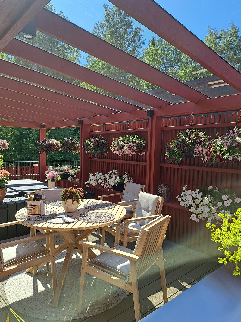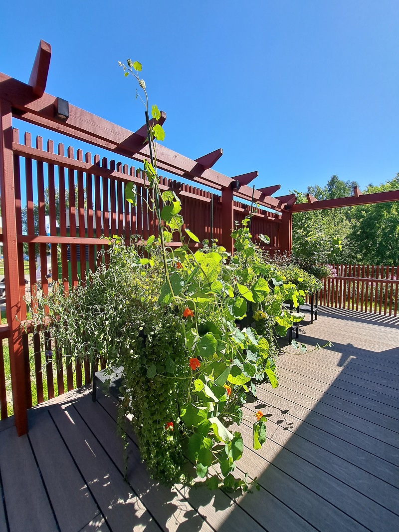 Kukkivilla ja hyötykasveilla saadaan lisättyä viihtyisyyttä terasseilla, kuten tässä kohde 6 Villa Aurinkotuulessa.