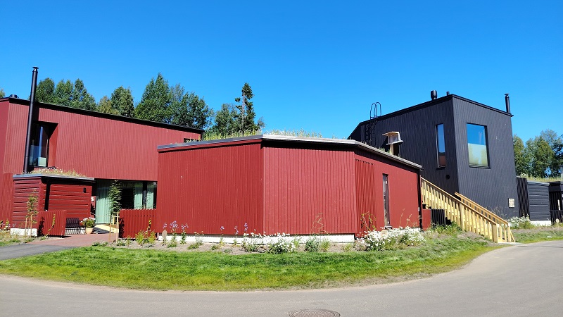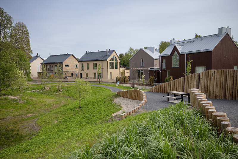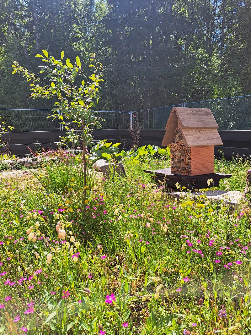 Niittymäistä piha-aluetta asuntomessualueella on runsaasti. Pörriäiset ovat saaneet oman hotellinsa Talo Hjemman (kohde 7) pihalla.