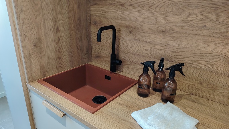 Terrakottaa värinä voidaan käyttää osana luonnonläheistä väritystä. Villa Satakielen (kohde 12) kodinhoitohuoneessa väriä on käytetty altaassa. Allas: Stala Essent CEG-E50C.