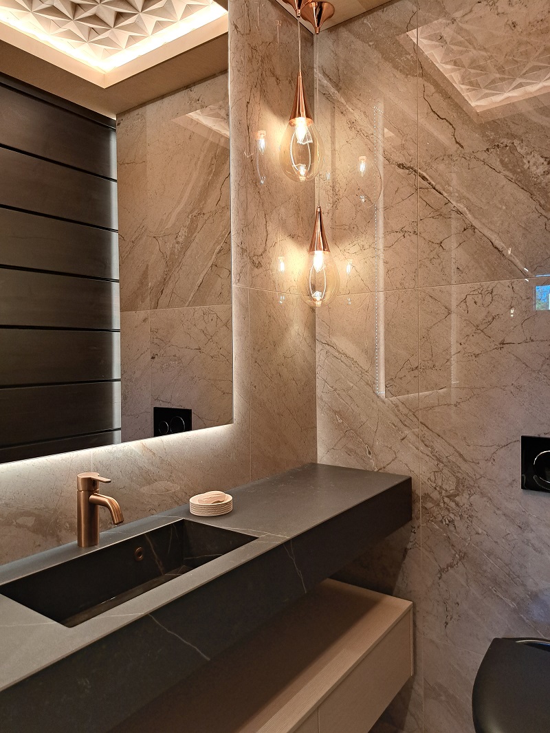 Sisustuksen yksityiskohtina rimoitukset, isojen laattojen käyttö sekä pystyyn ladotut laattapinnat ovat erittäin suosittuja.