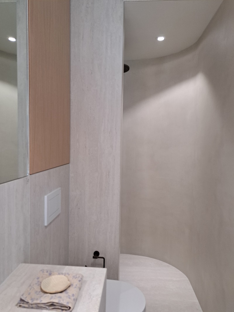 Kaarevat muodot, selkeät linjat ja suuret laatat ovat nyt kuuminta trendiä sisustuksessa. Kohteen 19 Hietasaaren Gård kylpyhuoneessa tämä toteutuu upeasti.