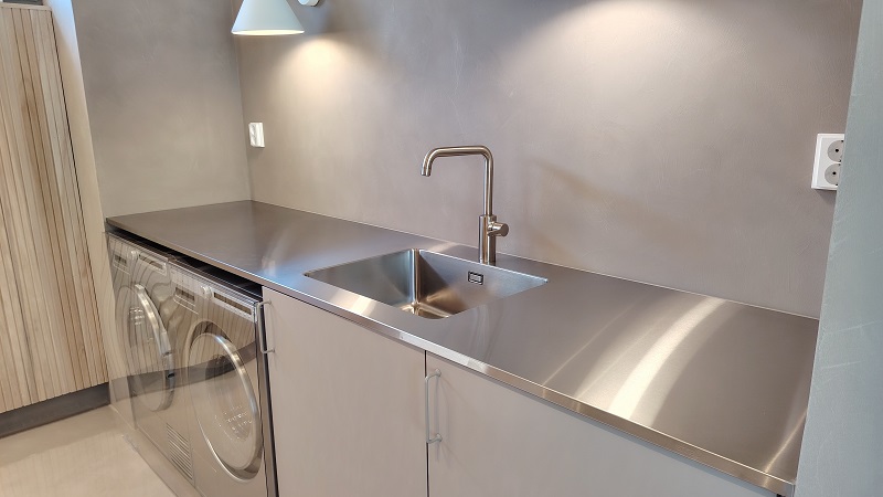 Ruostumaton teräs on myös suosittu sisustusmateriaali. Kestävyytensa ja helppohoitoisuutensa ansiosta rosteri pääsee oikeuksiinsa kodinhoitohuoneessa, kuten kohteen 21 Oulun Merta Tyrskyn kodinhoitohuoneessa. Ruostumaton terästaso Stalan K-ONE.