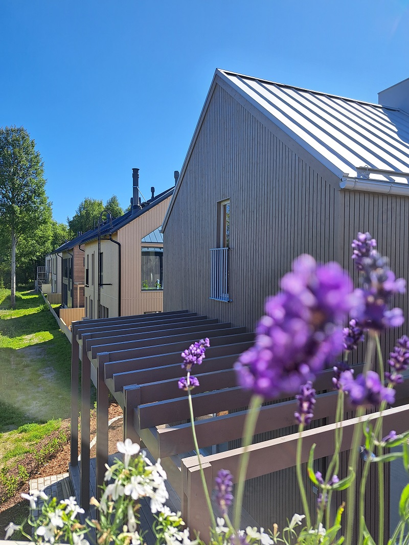 Kohteet 4 ja 5 Hietasaaren Veistot ovat massiivipuisia CLT-taloja, jotka edustavat kestäviä materiaalivalintoja.