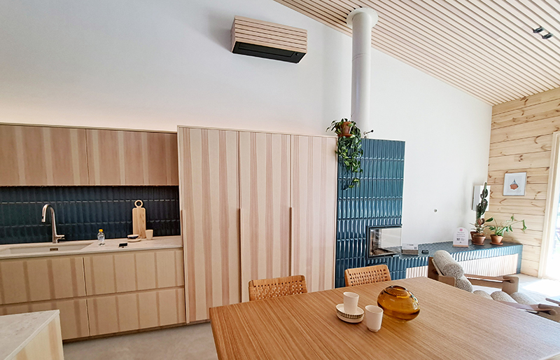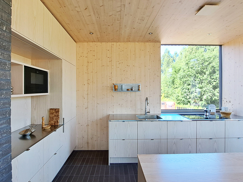 Talon sisustuksen läpileikkaava vaalea puumateriaali jatkuu myös keittiössä. Ruostumattomat terästasot (Stala K-ONE ja T-ONE) viimeistelevät puhtaan ja selkeän linjan. Keittiökalusteet: Ilona-Keittiöt
