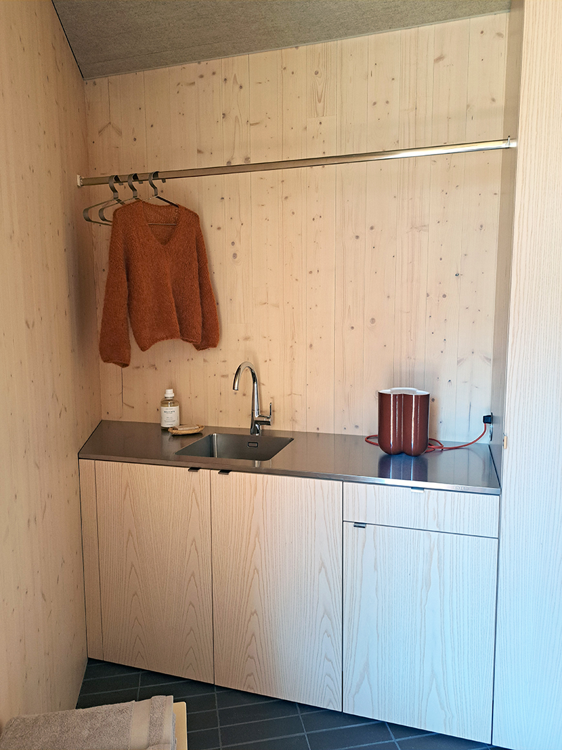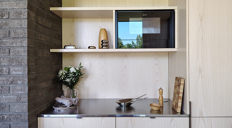 Kodinhoitohuone edustaa samaa selkeää materiaalilinjaa kuin koko talo. Ruostumaton terästaso, joka on muotoiltu seinän mukaan viistoksi vasemmasta reunastaan, on Stalan Tailor-made -mallistosta.