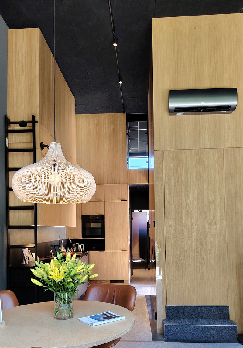 Talo Hjemmassa korostuu kiintokalusteiden rooli sisustuksessa. Yläkertaan menevät portaat on piilotettu osaksi kiintokalusteita ja kausisäilytystilat on integroitu osaksi keittiötä. Huomiota herättävää on keittiöön sijoitetut tikkaat, joilla pääsee kiintokalusteiden ylimpiin kaappeihin. Voi, miten upeasti talon 53 neliöinen tila on käytetty hyödyksi!