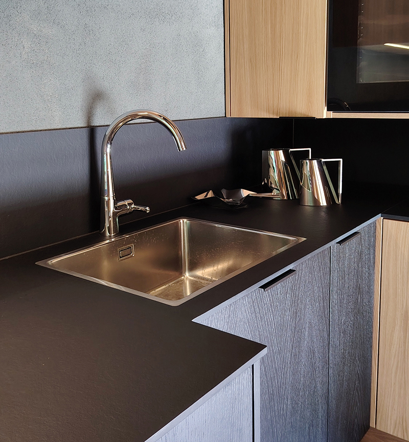 Yhtenä keittiön erikoisuutena on myös kulmaan tehty kapeampi kaapisto, jossa vesipiste sijaitsee. Keittiötaso: Ecolam, allas: Stala Lagom-50.