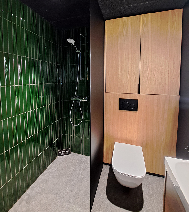Sama kiintokalusteilme jatkuu myös wc-tiloissa. Värikäs kaakeleiden pystyladonta on nyt suosiossa.
