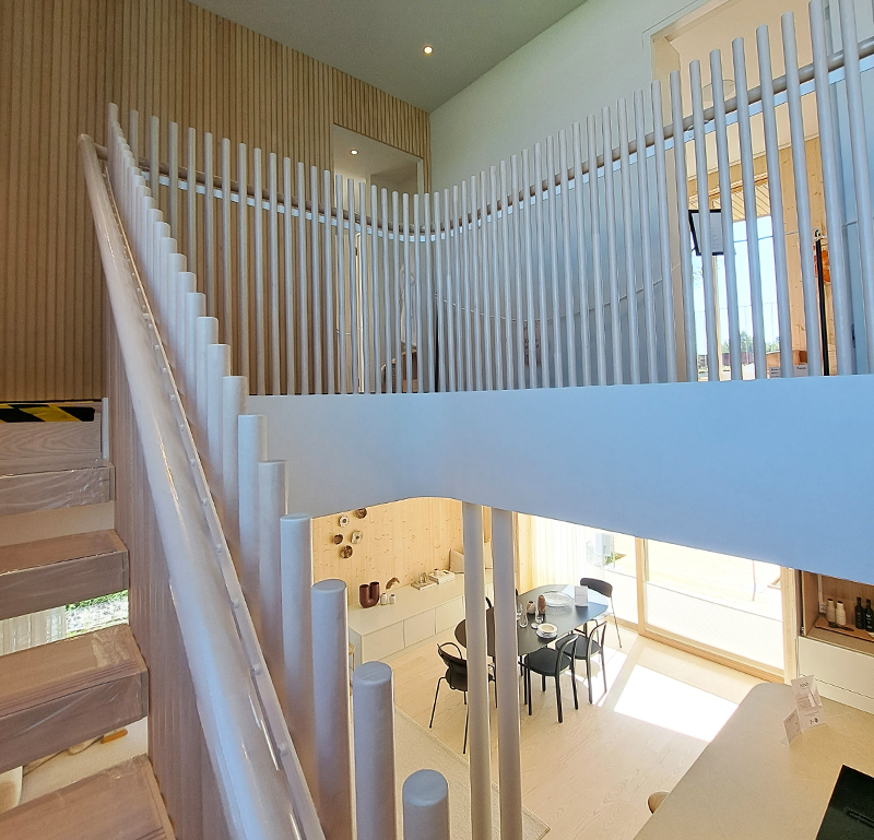 Rimojen käyttö jatkuu myös portaiden ja yläkerran kaiteissa sekä rimaseinänä yläkerrassa.