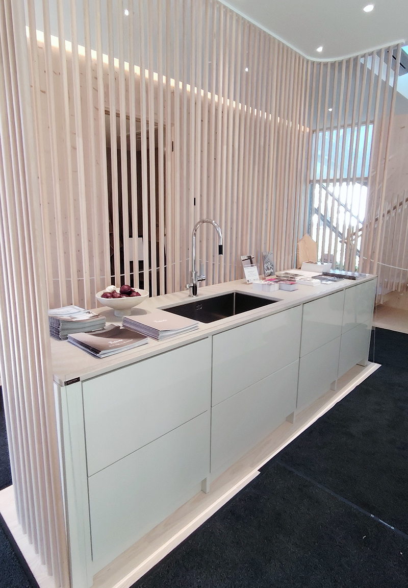 Pyöreä muotokieli ja rimojen käyttö yhdistyvät keittiön ja eteisaulan erottavassa seinässä. Läpinäkyvyys luo tilaan ilmavuutta. Kalusteet: Aina keittiöt, kivitasot: Cosentino Finland, kivitasojen työstö: Kivilähde, allas: Stala Ultra-70, hana: Tapwell.