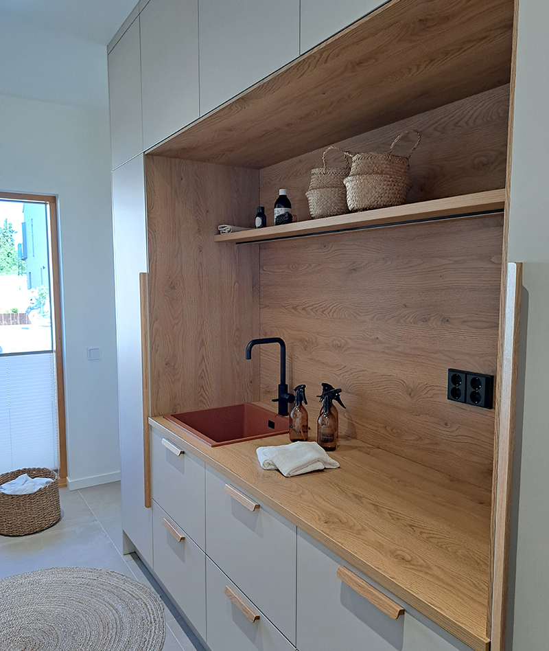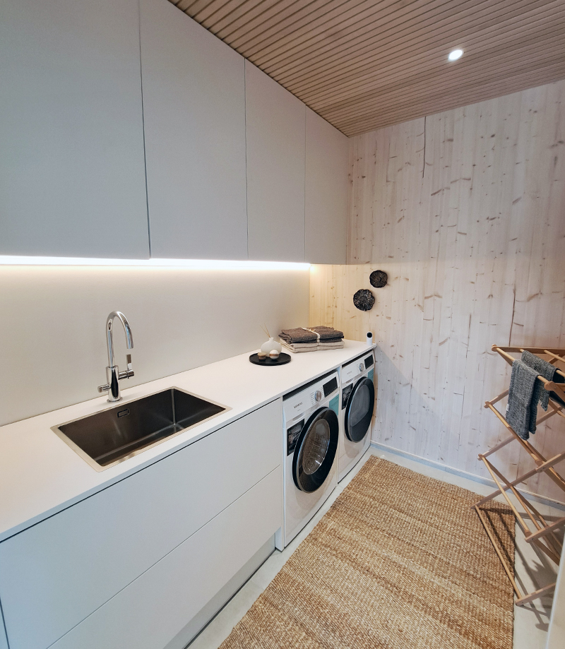 Vaalea sisustus jatkuu myös kodinhoitohuoneessa. Kiintokalusteet: Aina-keittiöt, allas: Stala Ultra.