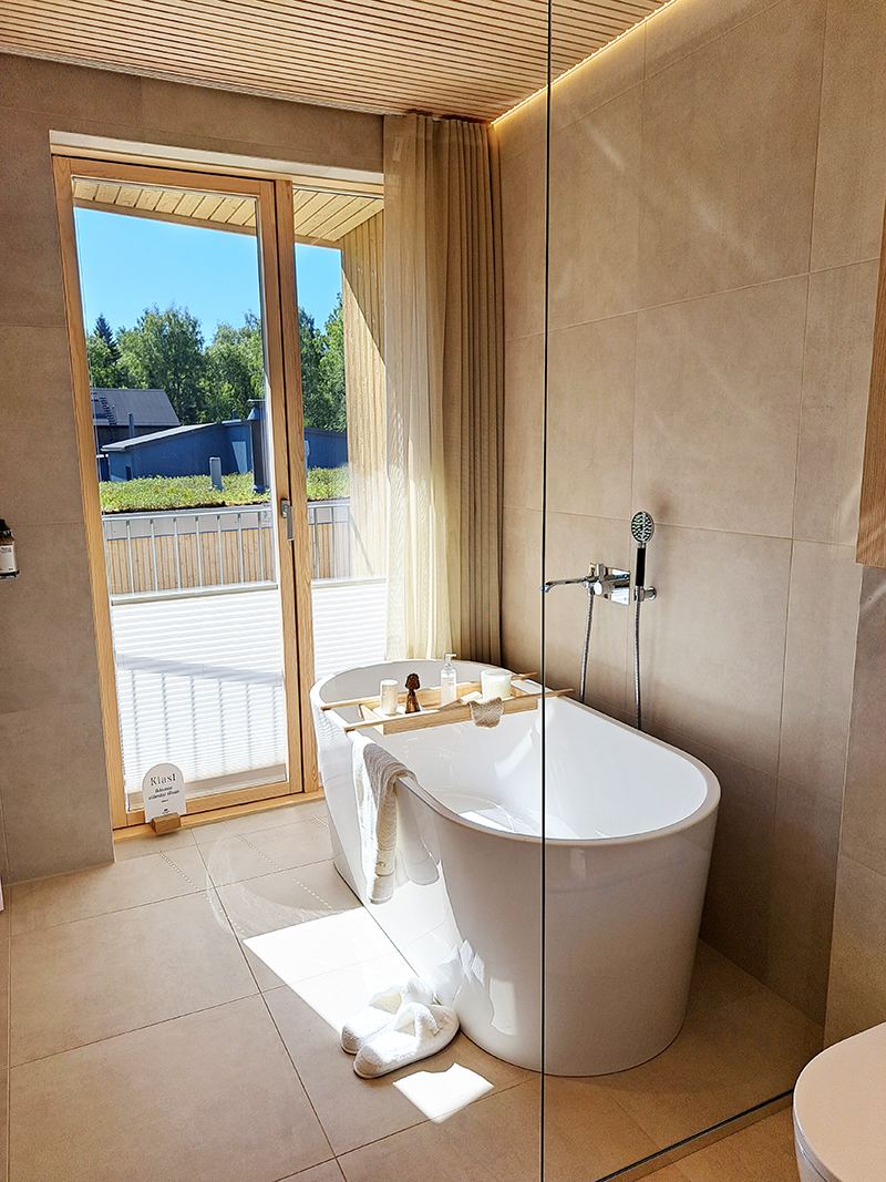 Valkoisen ja hiekan sävyt läpileikkaavat Villa Suojan sisustuksen. Kylpyhuoneessa rimoitus on katossa, hiekan sävyiset laatat koristavat seiniä ja lattiaa. Valkoinen amme: Bathlife Ideal