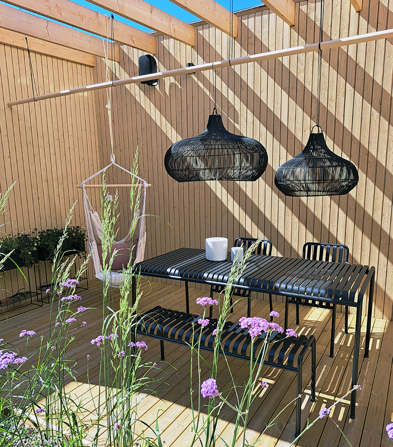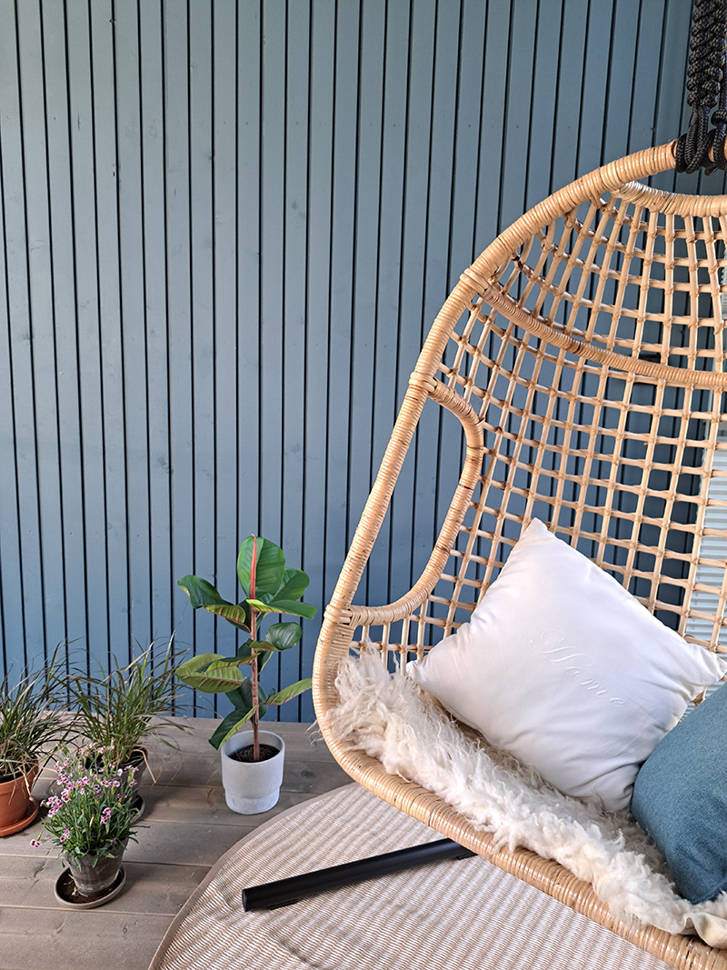 Sininen ulkoverhoilu on piristävä ja samalla rauhoittava tausta ulkona elämiselle.