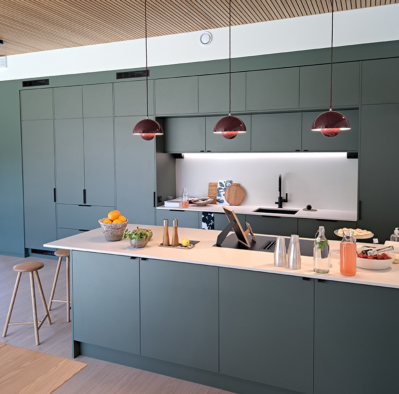 Keittiö-/oleskelutilaan väriä tuo vihreä keittiökaapisto saarekkeineen. Keittiökalusteet: Ideal keittiöt, Kivitaso: Nerostein, allas: Stala Essent CEG-E50B, hana: Tapwell.