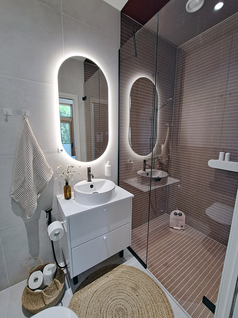 Vaaleat maanläheiset sävyt saivat kaverikseen rohkeampaa väritystä kylpyhuoneen laatoituksesta.