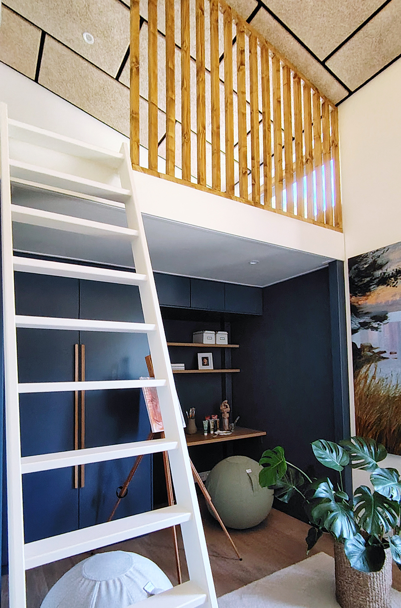 Yläkertaan vievät portaat on piilotettu mittatilaustyönä tehtyihin kiintokalusteisiin, jotka on tehnyt oululainen puuseppä Timo Näppä. Liikuteltavilla mustilla tikkailla pääsee kausisäilytystiloihin.