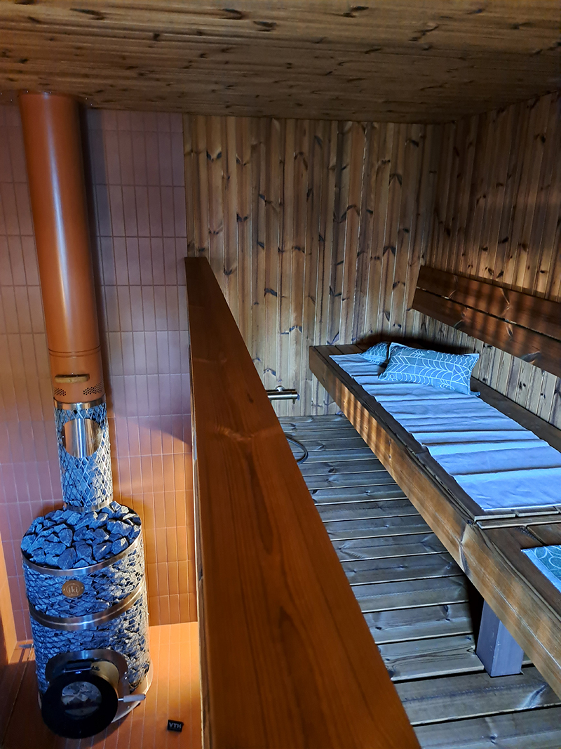 Tämän kohteen ehdoton vetonaula on kaksikerroksinen sauna. Saunan upeat portaat, puinen kylpytynnyri ja korotettu kiuas saavat sydämen pakahtumaan.