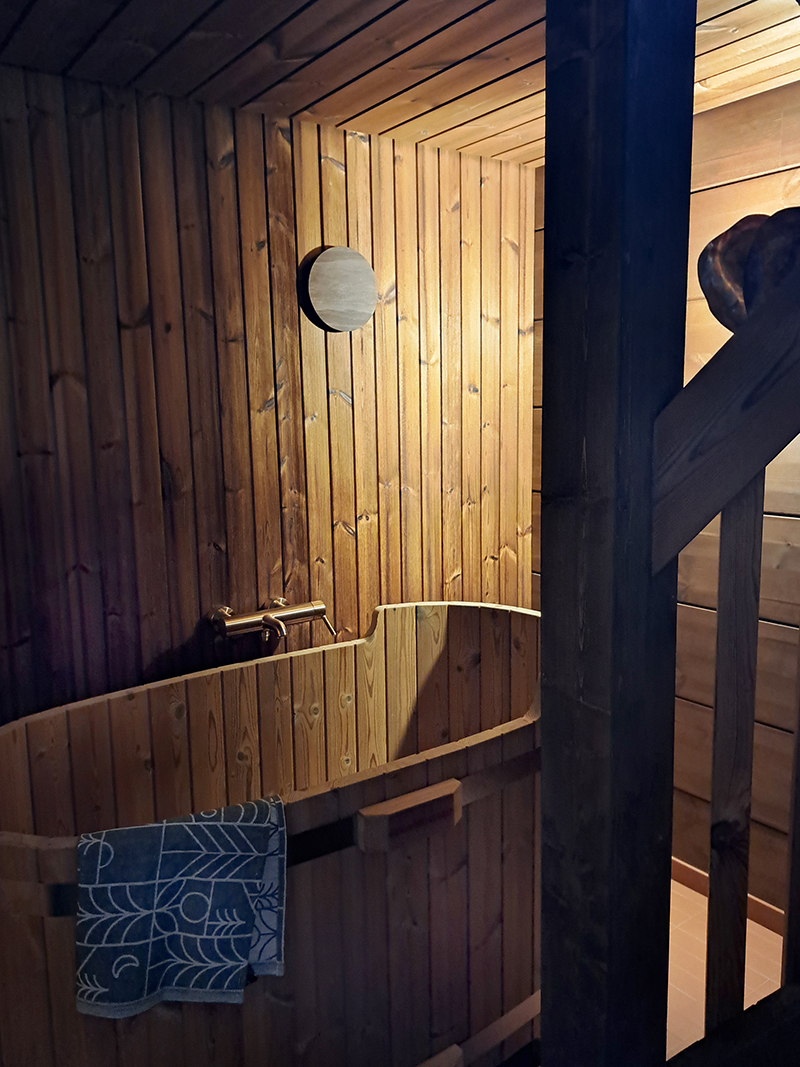 Puinen kylpytynnyri sopii saunan tunnelmaan täydellisesti. Lauteet sijoittuvat kylpytynnyrin päälle.