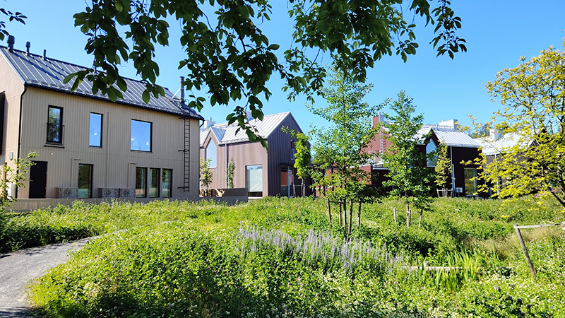 Rakennukset on sijoiteltu tontille siten, että niistä muodostuu suojaisa sisäpiha. Iso terassialue mahdollistaa erilaisia ulkotiloja, joita ryhmittävät rennot istutukset. Terassin ruoanlaitto- ja ruokailutila on suojaisa pergolamainen syvennys talon kainalossa.
