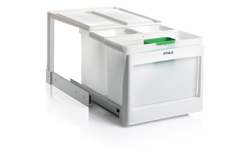 Kiskoilla liikkuva kannellinen jätevaunu kahdella 10 litran astialla, yhdellä 16 litran jäteastialla sekä ongelmajäteastialla. Kaapin minimileveys on 45 cm. Kokonaistilavuus 36 litraa.