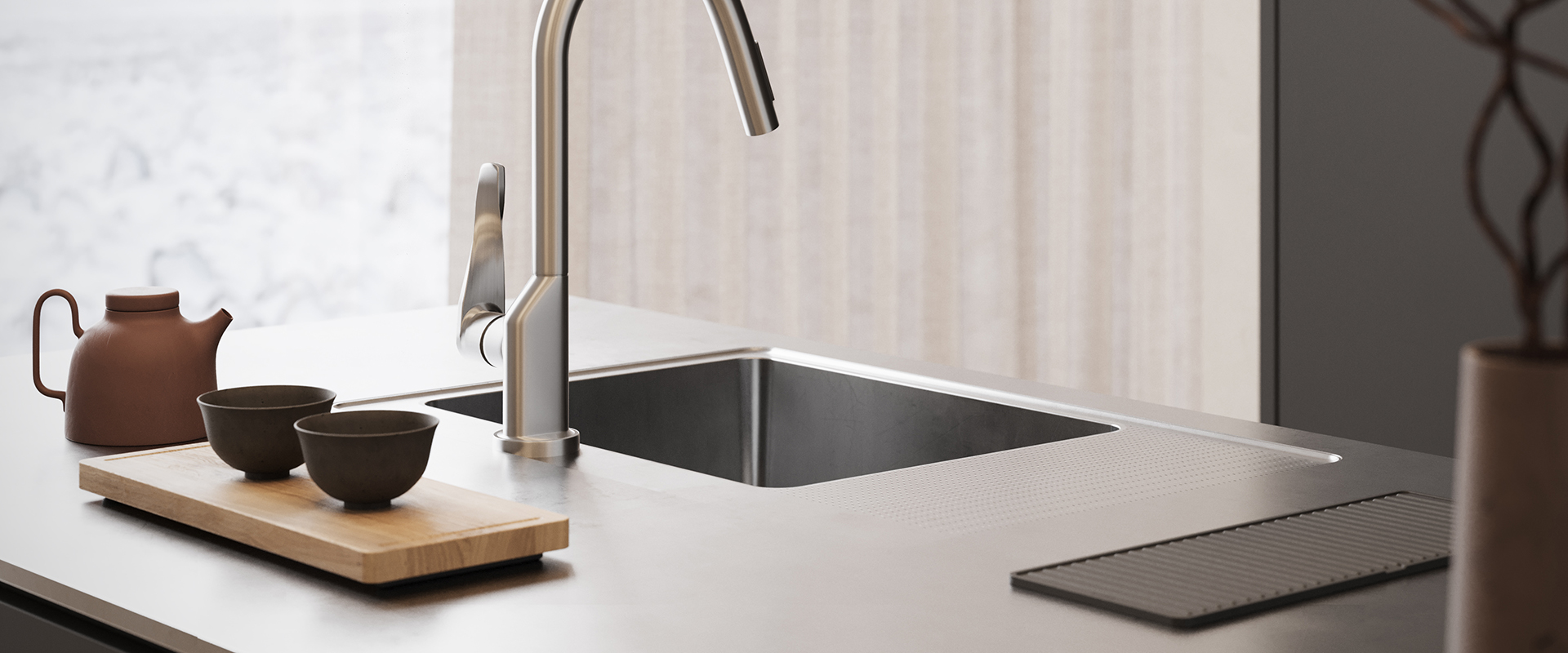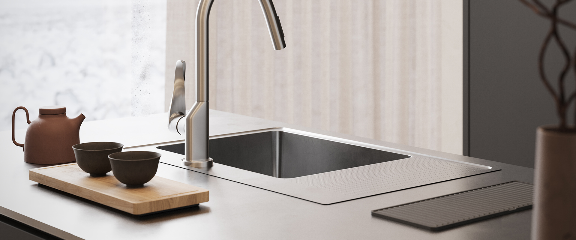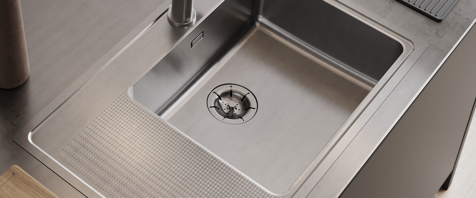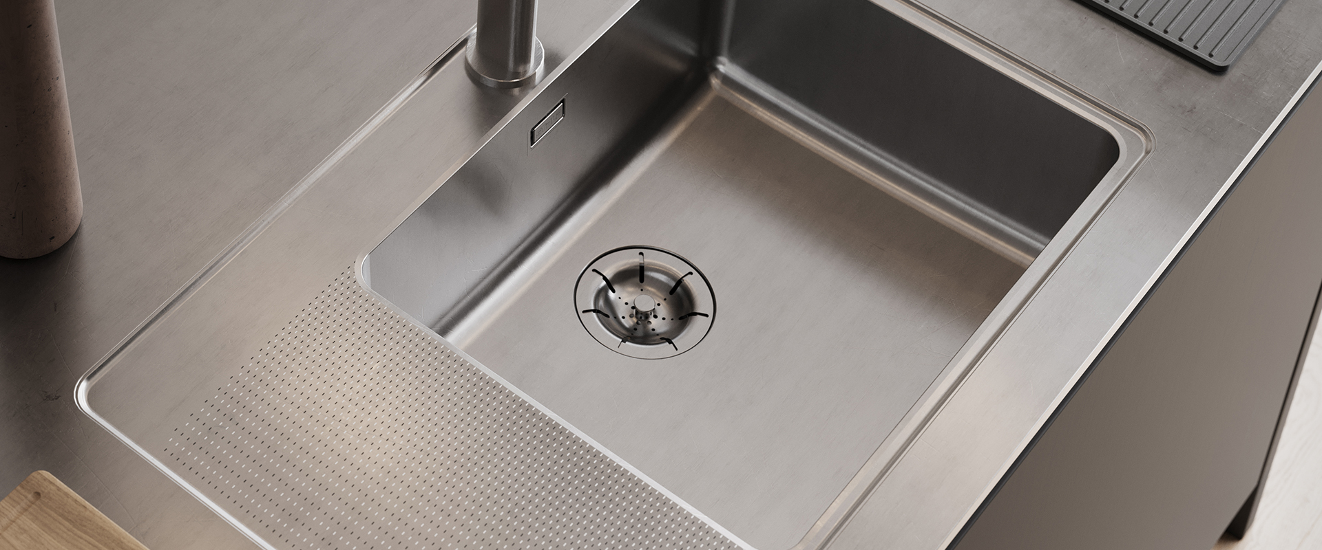 Täysin uusi Flow-pohjasihti lisää myös osaltaan keittiön toiminnallisuutta. Uuden pohjasihtimuotoilun ansiosta altaan käyttö on mutkatonta, puhumattakaan silmiä hivelevästä ulkonäöstä.