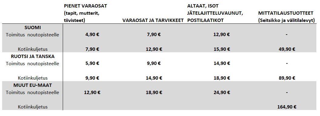 Toimituskulut määräytyvät oheisen taulukon mukaan. 'Kassa'-sivulla voi tarkistaa tilaukselle mahdolliset toimitustavat sekä niiden hinnat.